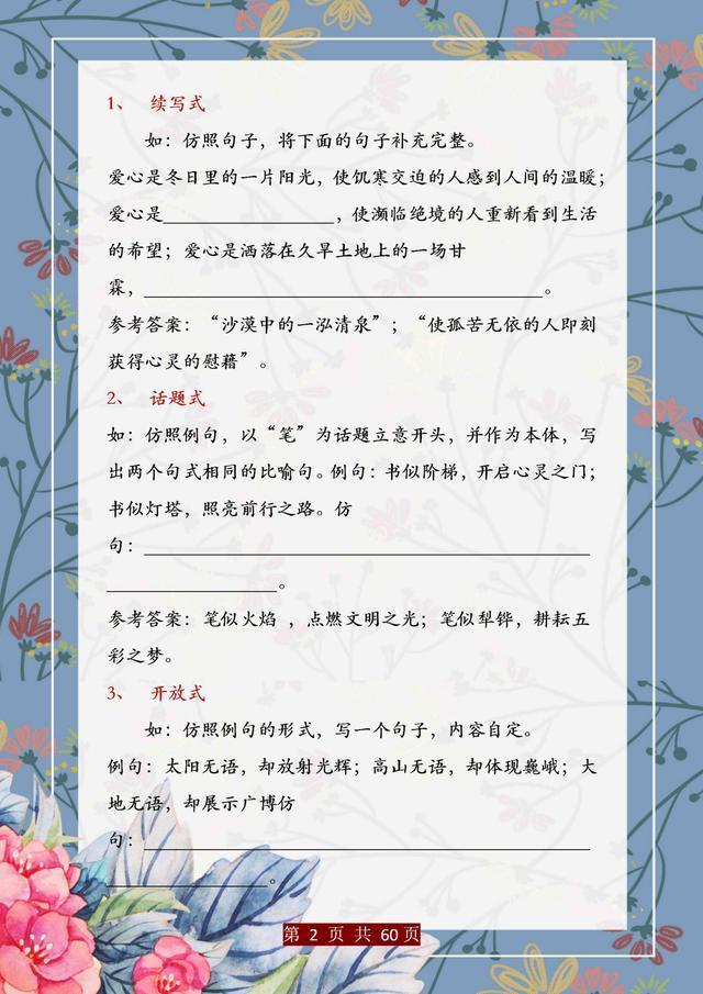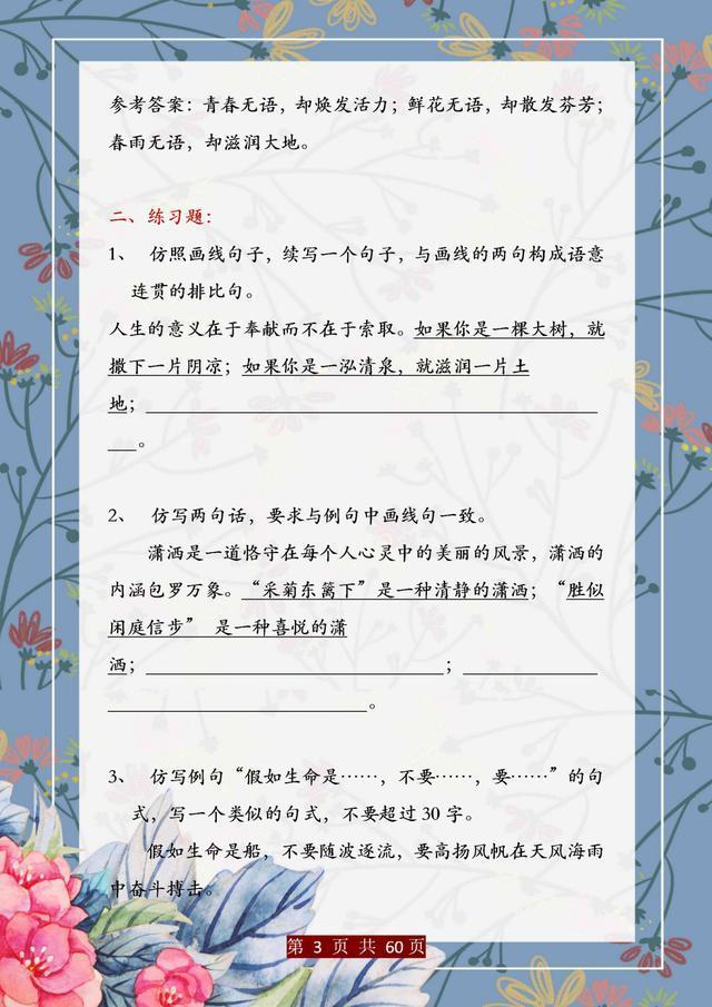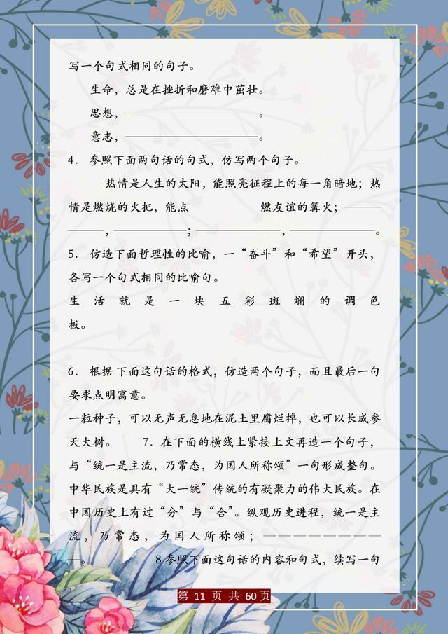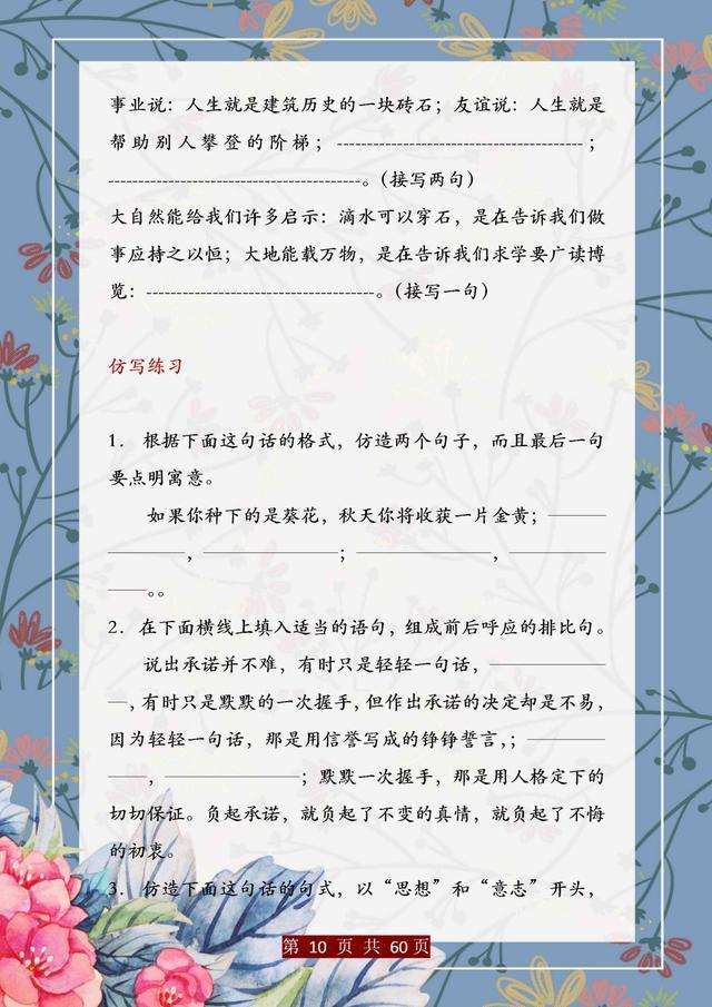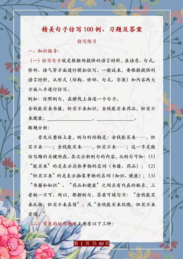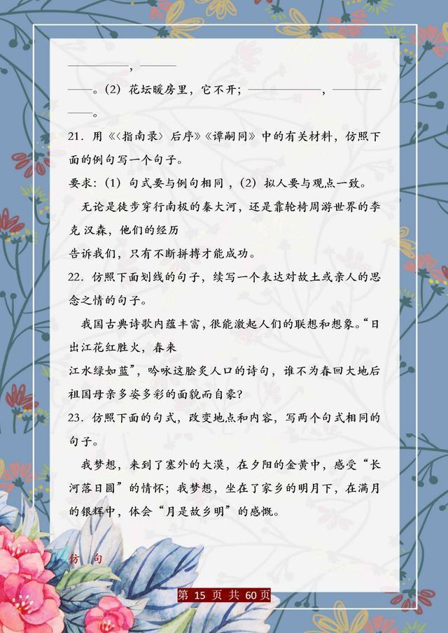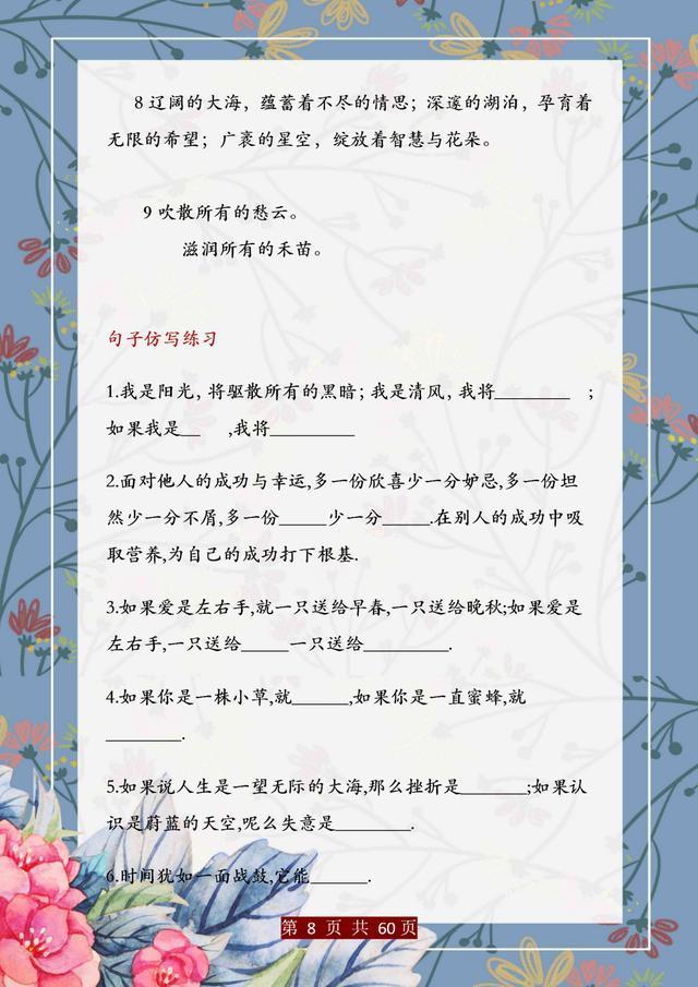 句子仿写是语文基础能力的训练,只有把句子基础知识掌握完善、扎实,后面的学习才能往上走。这份资料,董卿直言:精美句子仿写100例,孩子吃透,哪次考试不能拿第一!相信一定能帮助大家。