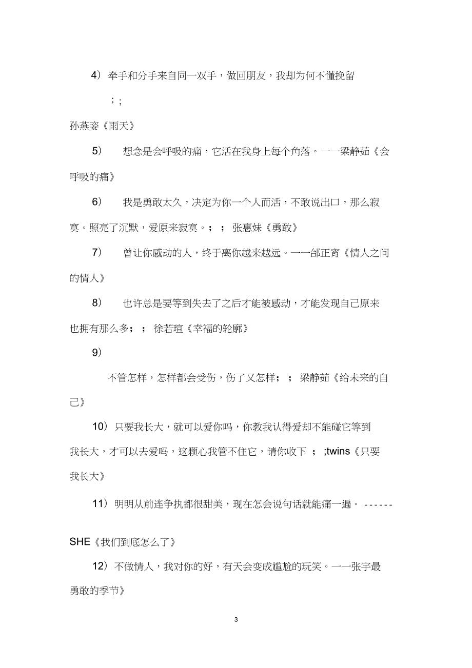 歌词中有哪些句子是好听的呢下面是学习啦小编整理的歌词里好听的句子,欢迎阅读 歌词里好听的句子 1 到现在我才相信,我这一颗心早比爱先一步死。本栏目为您介绍赞美好歌词的优美句子内容包括对歌词优美的赞成句子歌词中优美的句子有哪些,歌词中的优美句子,关于赞美歌词的优美句子,如果您。1耳边同时放着自己最喜欢的歌歌声时而婉转动人,如山涧中的***流水歌声时而***澎湃,如大海的滚滚浪花歌声时而忧郁悲伤,如林黛玉***伤悲,看花坠。