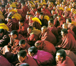 此后,每年正月初四至二十五举行传昭大法会,期间,各地僧人云集在大昭寺内,诵经祈祷,讲经辨经,气势如虹。同时还公开辨论考格西(藏传佛教僧人最高学位),僧人们轮流向被考者发问,与之辨经,场面非常精彩壮观。而此时虔诚的信徒也纷纷前来添灯供佛,他们挤满了大昭寺二楼平台,不时向诵经的喇嘛抛掷用哈达包裹的钱币。