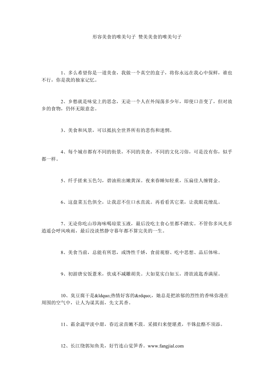 55每个城市都有不同的街景,不同的美食,不同的文化习俗,可是没有你,似乎都一样 56品位美食,而不是品位菜单,烧一锅好菜,也绝不是烧钱 57。读书人作文网小编整理了描写食物美味的优美句子,希望对你有帮 俗话说得好民以食为天而中国五千年的美食文化源远流长我们只是知道了,冰山一角。关于美食的经典文艺句子素材 中国的美食文化博大精深,没有哪一个人能够抵得住美食的诱惑的下面是第一范文网小编特地为大家整理的一些关于美食的经典。