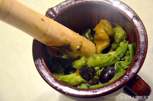 擂辣椒皮蛋,很有特色的一道菜,整根的辣椒和皮蛋放在缽中,擂均匀后吃,辣椒的清辣混合着皮蛋的清香,简直绝配。