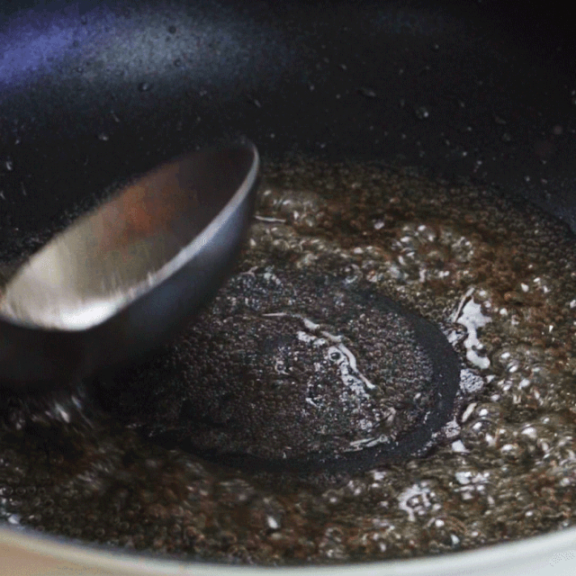 再次热锅炒糖色,半碗油水往下落,十五块冰糖中火融化,会有少许糖黏在铲子上,没关系,待会一煮就下来。