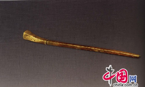 金笄长27.7厘米,头宽2.9厘米,尾宽0.9厘米,重108.7克,器身截断面呈钝三角形,在其尾端有一长约0.4厘米的榫状结构,可能原镶嵌有其他装饰品。笄也叫簪,是簪的本名,早在新石器时代已有骨制的发笄,用于盘发挽髻。商代及周代时,女子插笄,标志着成年,谓之壹绑怯,《仪礼》(传为周公所作,为规范起居饮食的法则)载,女子年满十五,梳髻插笄,表示成年,可以许嫁,并举行仪式,称为殷抢裼。
