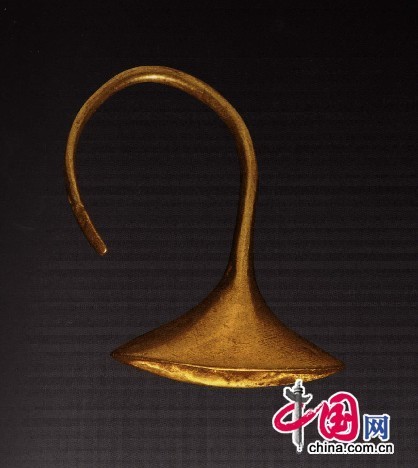 金耳环通高3.4厘米,重6.8克,耳坠部呈扇形,往上由粗及细弯成半圆形,尾端收束成尖锥形。