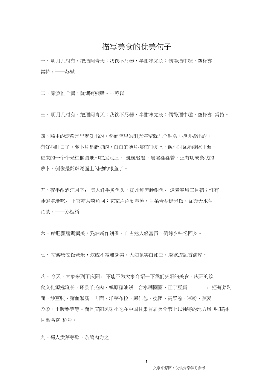 描写美食的优美句子1 色如玉版猫头笋,味抵驼峰牛尾猩2 时绕麦田求野荠,强为僧舍煮山羹3 食为天性,静静地咀嚼,轻轻地回味,非比寻常的韵致。七做美食就像做人,必须真材实食料,还要去杂选优精心烹饪才会成为美味佳肴 八烧卖里碧绿的颜色,透出蒸熟后薄如纸的面皮,犹如翡翠一般轻轻地咬上一口,皮一点。