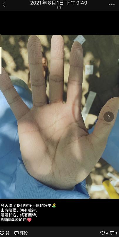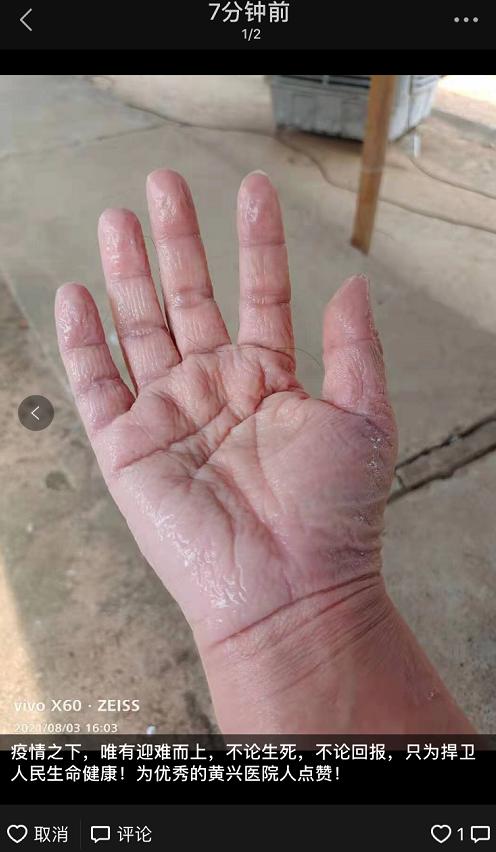 天真的很热,活动也很热。实在忍不住想喝水时,我走进保安室摘下手套,打开手套那一霎那,汗水流了一地,小视频里的防疫人员的汗水情节我也算是亲历了,双手泡成了泡椒鸡爪,有惨白的深深的纹。这才几个小时啊,就这样了,那些成天包在防护服里的医生护士真心不易。