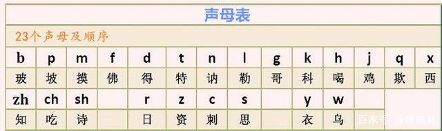 b、p、m、f、d、t、n、l、g、k、h、j、q、x、zh、ch、sh、r、z、c、s、y、w