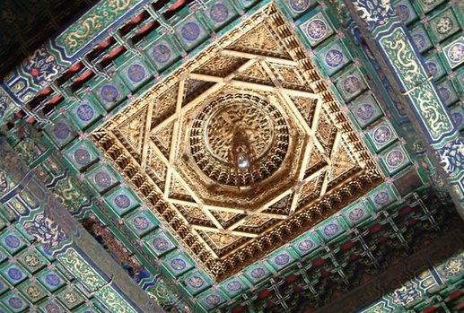 还可把目光向屋内看去,在那里,遮盖着室内空间木构架上的东西叫天花。 那也是神仙们居住最多的地方,同类的东西还有藻井文饰,为什么要叫井呢?因为木头容易着火,所以,要画点“水”上去。