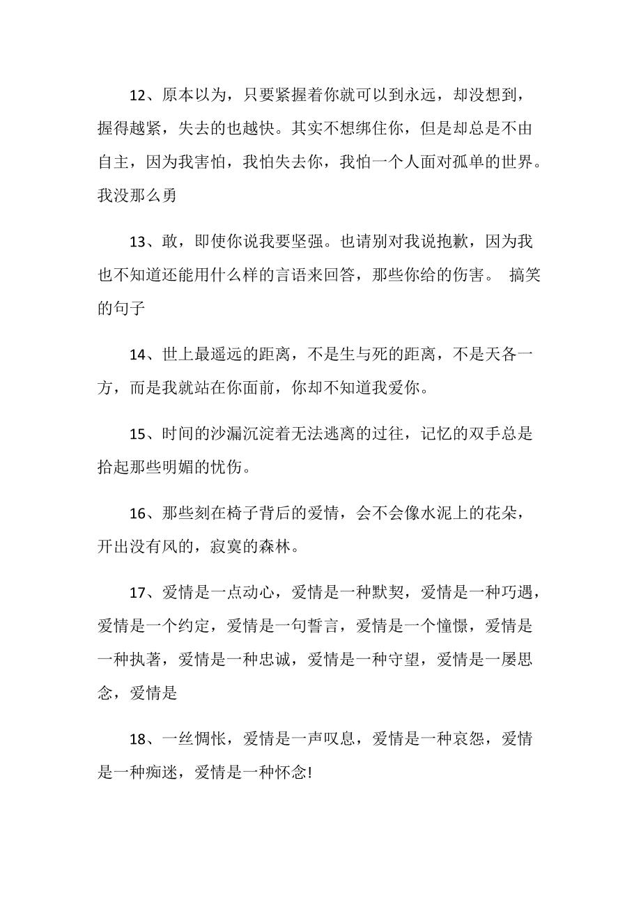 2018年12月18日关于爱情感慨的句子1初恋的人大多都不懂爱,所以初恋失败的多成功的少结婚应该找个未婚的,因为谁都喜欢原装 2想要走的更快,请独行要想。2020年9月4日爱情感慨句子说说心情 1最好的承诺,不是爱你一万年,而是根本不需要承诺 2最初不相识,最终不相认 3每个喜欢文字的孩子,都有一段一碰即痛的。2020年10月20日爱情感慨句子说说心情,爱情句子,1我在红尘渡口等你,从前世到今生,无怨无悔你在十字路口等我,从年少到白头,朝朝暮暮2有没有一个人,你。