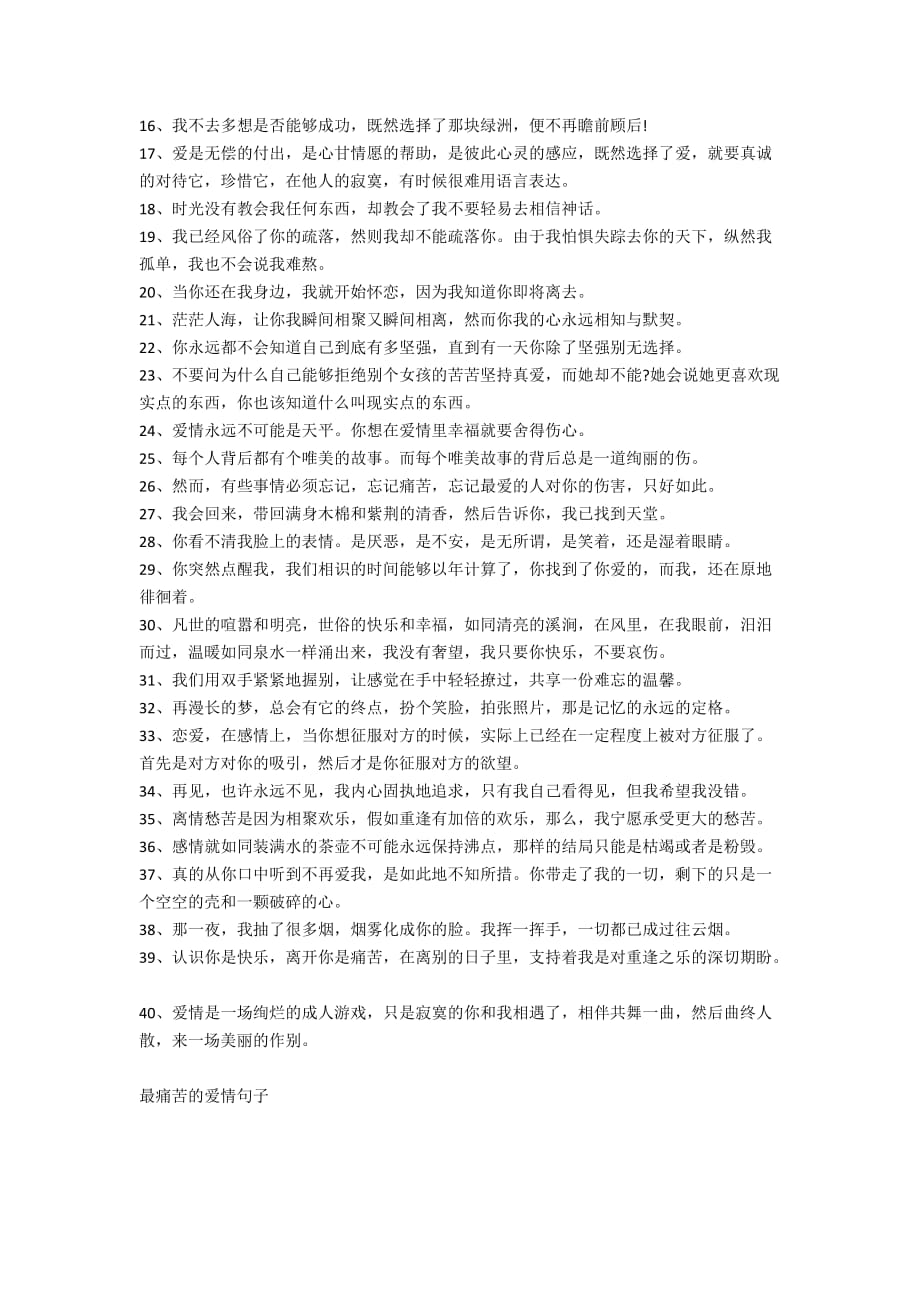 2017年3月11日无奈伤痛的爱情句子1爱一个人就是要拿自己的去填补对方的空虚2本来和文字沾上边的孩女从来都是不欢愉的,他们的欢愉象贪玩的小孩,逛荡到天。2020年1月13日没有经历过痛苦的爱情是不深刻的爱情使人生丰富,痛苦使爱情升华 34其实我一直在你身边守候,等你靠在我肩上诉说,会不会有那么一天,你的温柔。2020年6月23日5我现在不明白爱情的含义是什么,但我知道爱情确实很痛苦我希望我现在的一切将会是永远,爱情有时候会很甜蜜,幸福有时候也会是人丧失理智,在。