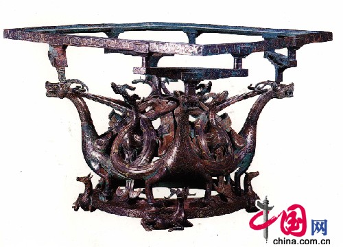 春秋战国时期的中原金器,虽然数量不多,但都很有特色,这些器皿形制较大,用金量一般都较多。这些器皿的出现,开创了我国金质器皿制作的先河,发达的汉唐金器正是在这个基础上发展起来的。这个时期金箔仍然大量使用,错金及鎏金工艺盛行,产生了一批错金及鎏金精品,但是,正是这种错、鎏金工艺成了铜艺的掘墓人,是青铜器的最后绝响。