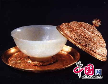 金托金盖玉碗,碗为玉质,托与盖为金质。玉碗呈青白色,温润清透,胎薄如纸。金盖以镂空云纹作地,再饰以浮雕状的二龙赶珠图案,盖顶为一莲花形钮,花蕊嵌有一颗红宝石,金托盘直径20.3厘米,重325克,盘底布满龙纹,边沿饰祥云纹,中央有凸出的一圈,以固定玉碗。玉碗的清润与黄金的光泽相配,色调一冷一暖,在华贵中见雅致,十分和谐。