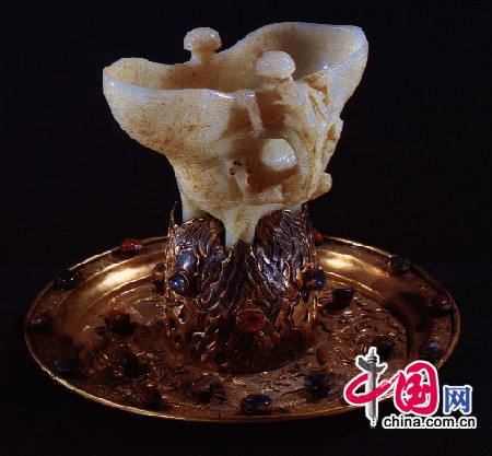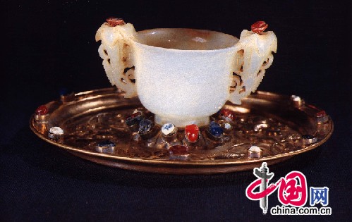 鎏金银托盘双耳玉杯,明,北京定陵出土