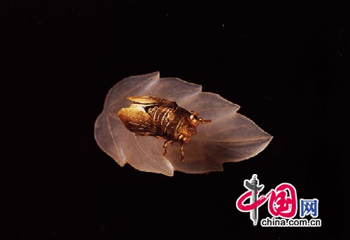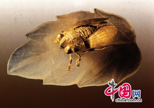 金玉结合的饰品有南京博物院收藏的一件金蝉玉叶,金蝉形神兼备,刻画细致入微,栖息在玉质的叶片上,传神地再现了一幅生动的金声玉振的画面。