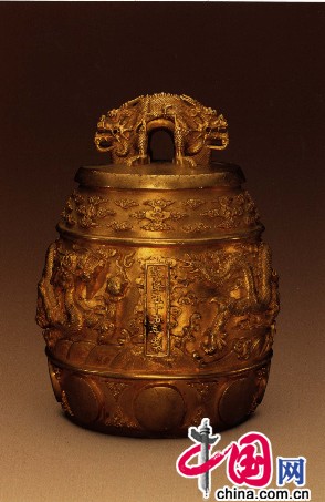 金编钟是清代皇帝举行大典时所用的一种乐器,共16枚,与战国编钟不同的是,其大小外形都基本相同,但由纯金制成。钟顶钮为交龙状,两端为龙头,龙身相连,可穿系悬挂。钟身上段饰浮雕祥云纹,中段雕饰双龙戏珠,并有方框,内铸“黄钟”“大吕”等律名,下段为八个圆形音乳,间饰云纹。一眼望去,龙腾于波涛云雾之中,鳞须毕现,矫健异常,令人骇异。皇家威仪借助龙的凶猛神气和大量珍贵黄金的使用得以显现。