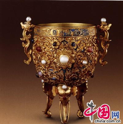 金瓯永固杯专门用于清代皇帝每年新春举行的开笔仪式。瓯为盛酒器皿,喻疆土、政权。此杯呈斗形,两侧有耳为夔龙,龙头上各嵌珍珠一枚,足为三个卷鼻象头,托起金杯,象征稳健。杯口堑刻有篆书“金瓯永固”四字。依清朝典制,每年除夕子夜时,皇帝在宫中养心殿东暖阁将屠苏酒注入金瓯永固杯中,陈于案上,然后在烛光中书写新春第一笔,祈求国泰民安,江山永固。金杯通体雕饰宝相花和西番莲纹,以红蓝宝石作花心,杯型与花纹都显得较为古朴,宝石则平添了一种高贵气质。