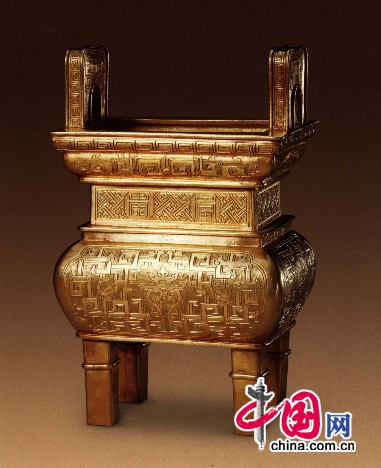 清代流传下来的几件典礼御用金器,器型都较大,而且黄金及珠宝用量都相当多,可以说是史无前例。战国最重的金器为曾侯乙墓出土的蟠纹带盖金盏,重2156克,西汉最重的金兽重9000克,此后历代均无重器,明代最重的孝靖皇后凤冠为金玉结合器,重2320克,而清代超过万克以上的就有多件,一件为四臂观音金坐像,高90厘米,重31800克,一件金编钟,高21.2厘米,最大直径20.6厘米,重24500克,另一件嵌松石碧玺藏文金塔高80厘米,重29258.6克,现存最重的清代金佛塔通高5.33米,用金量为35万克,而康熙五十四年制作的一套编钟,总重量也达到了46万多克。这个挥金如土的皇室,甚至在民国没落时期还不得不以极低的价格大量出售或抵押皇宫所藏的金银珠宝,继续挥霍。