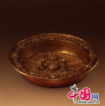 八宝双凤金盆是清代宫廷后妃仪仗中使用的一种金器,边沿较宽,其上饰浮雕花纹一圈,共有十二式,即十二件吉祥物,依次等距排列,如法螺、灵芝、宝伞等,吉祥物两侧饰有漫卷飘舞的彩带,暗含“吉祥万代”的寓意。其间镶嵌红珊瑚、绿松石等物,色彩绚丽。盆底中轴线排列三朵凸纹莲花,两侧各有一凤,地纹为卷叶纹,布满了盆底,亦暗含有“年年丰收”之意。