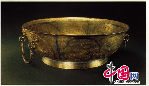 鎏金双耳圈足银盆,唐,陕西扶风法门寺出土