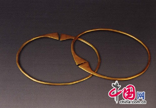 迄今为止,在史前遗址及夏代文化遗址中没有发现任何金子及其制品的影踪。商代的历史近六百年,西周近三百年,也只有极少量的金饰品出土。这一时期的金器都是用于装饰的金箔、金叶或金片,形制相当单纯,工艺也很简单,突显的是金子本身的色泽之美,起简单装饰的作用。
