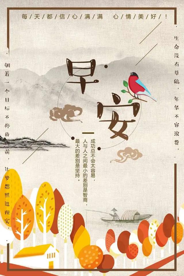 3、梦想也是一个“双面人”。在年少的时候,它离人们仿佛那么远、那么渺茫、那么不真实;而在壮年时,它离人们仿佛又那么近,那么清晰,那么令人振奋。因为,壮年时的人们取得了成就,已经超越了自我,而在那成功的背后,洒下的是数不尽的汗滴与付出的说不尽的辛劳。早安!4、与其羡慕别人,不如做好自己。肤浅的羡慕,无聊的攀比,笨拙的效仿,只会让自己整天活在他人的影子里面;盲目的攀比,只会带来烦恼,不会带来幸福,更会带来痛苦。每个人,都应当认清自己,找到属于自己的位置,走自己的路。人生,越努力越幸运!~亲们,大家早安!