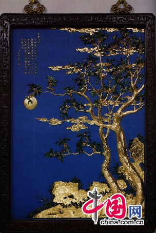 清代金工创造了与珐琅相结合的复合工艺,元代也有少量的这种复合工艺产品,但清代继元明之后创造了在金银器上点烧珐琅或掐丝填烧,珐琅透明亮丽,具有宝石般的效果,广州特别盛行这种工艺,故宫中收藏的一幅金挂屏即是当时广州的贡品。