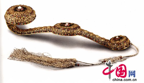 清宫中留存最多的珍玩尚有各种如意。如意最早见于《晋书》,最初用来搔痒,可如人意,因而得名。古时如意多用作佛僧讲经备忘工具或文人指画之用,近代则专为玩赏馈赠或进奉,寓吉祥如意之意。乾隆60寿辰时,王公大臣进奉金累丝万年如意,共计60柄。每柄均以黄金作胎,累丝镶嵌绿松石,并有甲子、乙丑等干支纪年和“万年如意”字样。60柄正好合一周甲。另有一枚如意,柄中央有“圣寿无疆”词,签条上书有“子皇帝臣溥仪跪进”,是清朝末代皇帝溥仪贺慈禧太后的礼物。