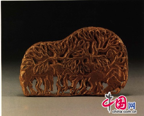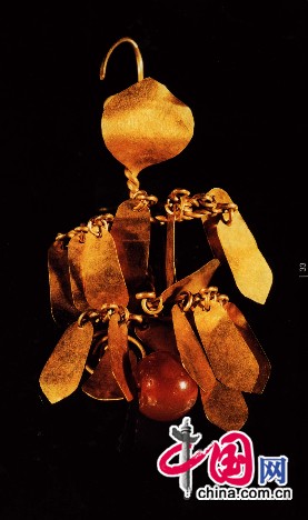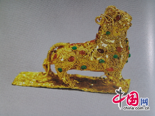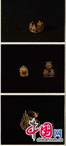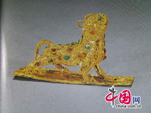 除了这些王陵,两汉时期北方及西北少数民族地区的金银器也有发现,牌饰及首饰较多,如吉林榆树县老河深鲜卑墓群,曾出土了一批金耳饰和项饰,项饰由266颗玛瑙珠和6只金管组成,金管呈圆筒状,间隔穿于橘红色的玛瑙珠之间。金耳饰有多种形制,其坠饰均较复杂,其中一件耳饰从上到下分为五层,每层依次吊饰有一片桃形金叶,五片圭形金叶,大环套两小环及一颗圆形红色玛瑙珠。青海祁连县出土的一件狼噬牛金牌饰,以浮雕和透雕的手法,表现了一幅数只恶狼在牛的下部撕咬牛的生动图景,牌饰器较大,制作十分精美。现天津市艺术博物馆还藏有一件虎羊纹金饰环,具有鄂尔多斯文化的特点,共由三部分组成,上为猛虎,身躯平直,俯首垂尾,双足踏于中部羊首的双耳上,羊头较大,嘴部作一弯钩,套衔一只圆环,此组合造型十分独特新颖。