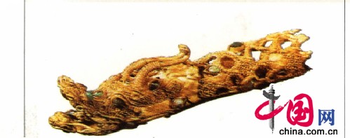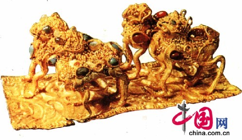 江苏邗江广陵刘荆墓中出土的金器则代表了当时南方金器的状况,其中主要是各种形状的饰件,如龙形、冠形、盾形、品形、挂锁形、金泡形等。龙形金饰的奇特之处,是在小如黄豆粒的龙头上,用金珠和金丝掐焊出了龙的眼睛、鼻子、角、牙、须及鳞甲等,精细如现代微雕。