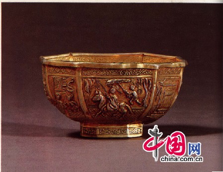 四川彭州市出土的一件莲瓣形金碗,口径为8.5厘米,呈五曲莲瓣式。无任何纹饰,通体光素,光亮如新。唐代也出现有通体光素或少纹素地的器物,以银器居多,但还不是很普遍,至宋代渐至增多,这种素地或无纹的金器,主要是为了保持金器的光泽夺目,以金子本色的光泽来悦人。又如上文说到的安徽休宁六角形杯,纹饰简洁,淡雅,素面区域较大,使整个金杯看起来十分清素秀雅。宋代金器纹饰一般没有唐代的丰富华丽,但洗练精纯远胜于唐,具有内敛的精神气质,与宋词、宋代瓷器、漆器的风格颇为一致。