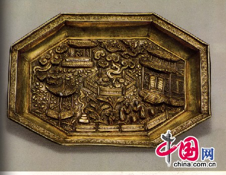 一些具有人物亭阁、诗词文章的画面,往往意境恬淡,具有文人士大夫的审美倾向。这种纹饰多是受到当时文人赋诗作画之风的影响。福建邵武故村出土的一件鎏金八角杯,呈八角形,通体鎏金,杯外八个腹面上有凸纹图案,杯心堑刻有一首词。外壁上的八个图案内容与杯内词意互相呼应。在画面上刻画有状元穿袍戴帽,骑马前行,随从前呼后拥等情形。人物景物较多使画面过于狭小,故纹饰多以线条勾勒轮廓,但仍不失诗情画意。另一件邵武出土的鎏金八角盘,盘内饰有亭台楼阁、门扉、窗棂、瓦垄,刻画入微,园内树木花草茂盛,两人相对作揖于楼阁前,天际处一龙一凤翱翔于云间。画面恬静而神奇,如人间仙境,反映出文人学士的审美情趣。