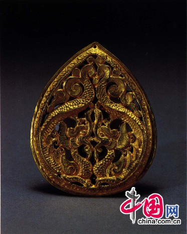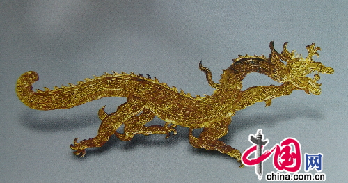 宋朝金器造型一般都显得小巧玲珑,其器物形体普遍较唐代要小,宋朝的金质器皿如盘、碗、盒等,直径一般都在20厘米以下,十分小巧轻薄。如江西彭泽县湖西村北宋易氏墓出土的金耳环,呈S形或8字形,坠部有浮雕状花卉,十分繁密细致,造型与通常耳环大异,十分精巧,也相当别致。又如南京幕府山宋墓出土有鸡心形金饰,龙凤金簪,团龙金簪、鎏金银盒等,都以小巧玲珑为特色,其中鸡心形金饰,形制虽小,但纹饰细密而精致,纹饰镂空,刻画了一对凤凰翱翔于牡丹丛中、葵花之下,暗寓丹凤朝阳的吉祥意义。另一件安徽宣城出土的鸡心形金香囊与此相似,由两片金叶锤压而成,正反两面均镂刻首尾相对的双龙纹,香囊边缘还饰有草叶和联珠,制作十分精细。而浙江义乌出土的一条金龙,打制得更是惟妙惟肖,龙长15.7厘米,宽1.8厘米,器形较小,但造型生动,龙昂首曲颈,张口吐舌,前后左肢向前伸展,右前肢着地,右后肢用力后蹬,尾巴粗长,尾端上卷,遍体显得矫健有力,气韵生动。这些金器的共同特点是在较小的形体中,通过精致而缜密的细部造型或纹饰图案,来拓展出一个生动的艺术空间,让人细细地把玩和品味,引发人的无穷想象。