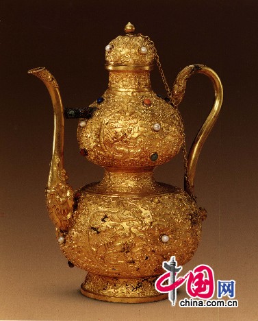 金壶较多,其中一件金堑云龙纹执壶,壶体呈瓜棱状,每一棱内堑刻有上下两组立龙戏珠图,共36条,龙体曲折盘绕,十分生动。盖为塔形,共四层,每层均刻二龙戏珠图,圈足上也刻有相似图案,为御用酒器。另一件执壶为葫芦形,造型丰腴古雅,壶盖堑番莲花,花心镶嵌珍珠,葫芦式壶体上采用浮雕手法遍饰游龙纹和祥云纹,并在壶身镶嵌红、蓝、绿各色宝石,宝石均为小粒,点缀于金龙祥云之间,加之器身较大,并不突出,倒衬出一种雅致。