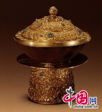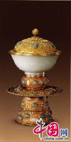 一般的金盘金碗之外,另有两件玉碗十分特别,一件为白玉错金嵌宝碗,碗用新疆和田的羊脂玉琢成,晶莹如凝脂,外壁饰有花卉枝叶,全部错金,并用了180颗小粒宝石嵌出红色的花朵。另一件高足白玉藏文盖碗,托与盖均系纯金打造,并满嵌浅浮雕凸纹,镶嵌松石、梅花,纹饰为勾莲纹与番莲叶纹,器形与装饰都有一些西亚文化的影子。