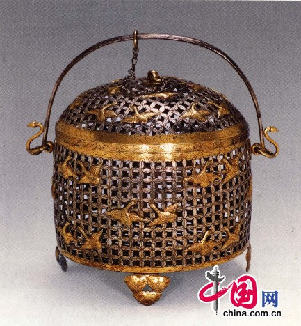 法门寺出土的鎏金镂空飞鸿球路纹笼子,是用来焙烤的笼子,通体镂空,由一体一盖两部分组成,盖和笼体分别有15只、24只鸿雁,除盖顶内圈几只外,其余均两两相对,笼体与平底成90度折角,无丝毫铆焊痕迹,根据专家研究,只有使用一次模冲成型才能达到这样的效果,而笼体12对向外凸起的鸿雁,又是一次模冲成型难以完成的,所以每次展出都引起人们的惊异和叹服。