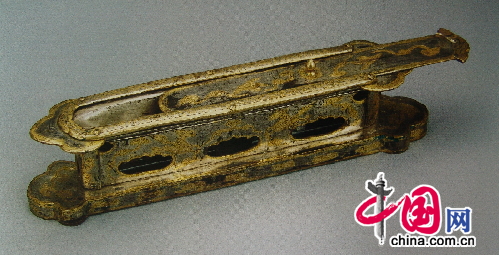 用于碾罗饼茶成茶粉的则有鎏金的碾子,由槽座、槽身、辖板、碾轴组成,铭文记载是由当时的皇家手工作坊文思院制造,并且标刻了重量,目的是为了防止有人以轻换重。
