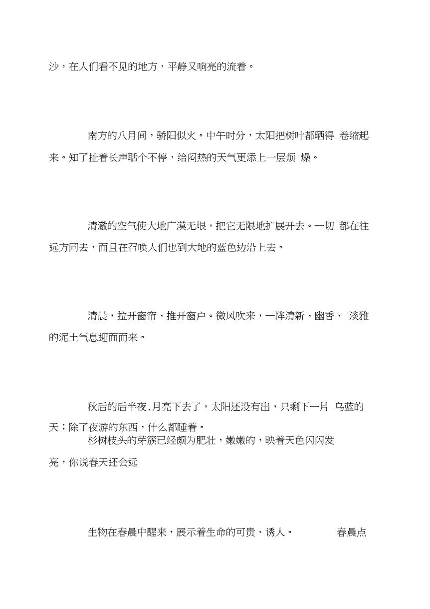 第2篇描写天气的句子摘抄 那年冬天,那个冷呀,把人冻得鼻*头疼,两脚就像两块* 七月,透蓝的天空,悬着火球般的太阳,云*好似被太阳烧化了,也消失得无影无踪 盛夏。描写景色的句子_ 描写景色的句子 1自然世界此刻是如此的美丽到处放射着明媚的阳光,到处炫耀着五颜的色彩,到处飞扬着悦耳的鸟叫虫鸣,到处飘荡着。