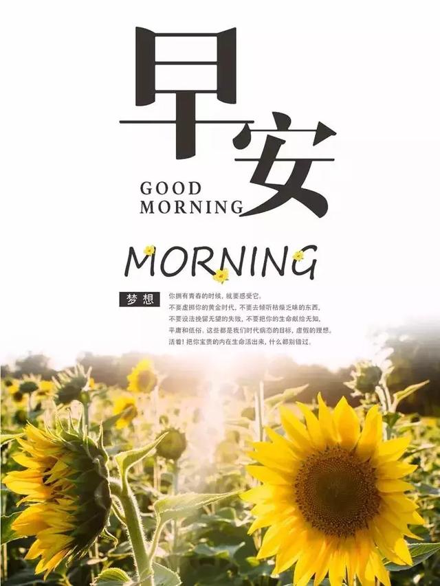 2、摔跤了,不要哭,再爬起来,站直一笑,拍拍尘灰,继续奔跑。正视人生的每一个挫折,适应人生的每一回起伏,吸取人生的每一场失败,利用人生的每一个坎坷。3、风再大,雨再狂,也不能赖床;身再累,心再忙,也别丢梦想;山再高,路再长,也要向前闯。托美丽的霞光,道一声早安!