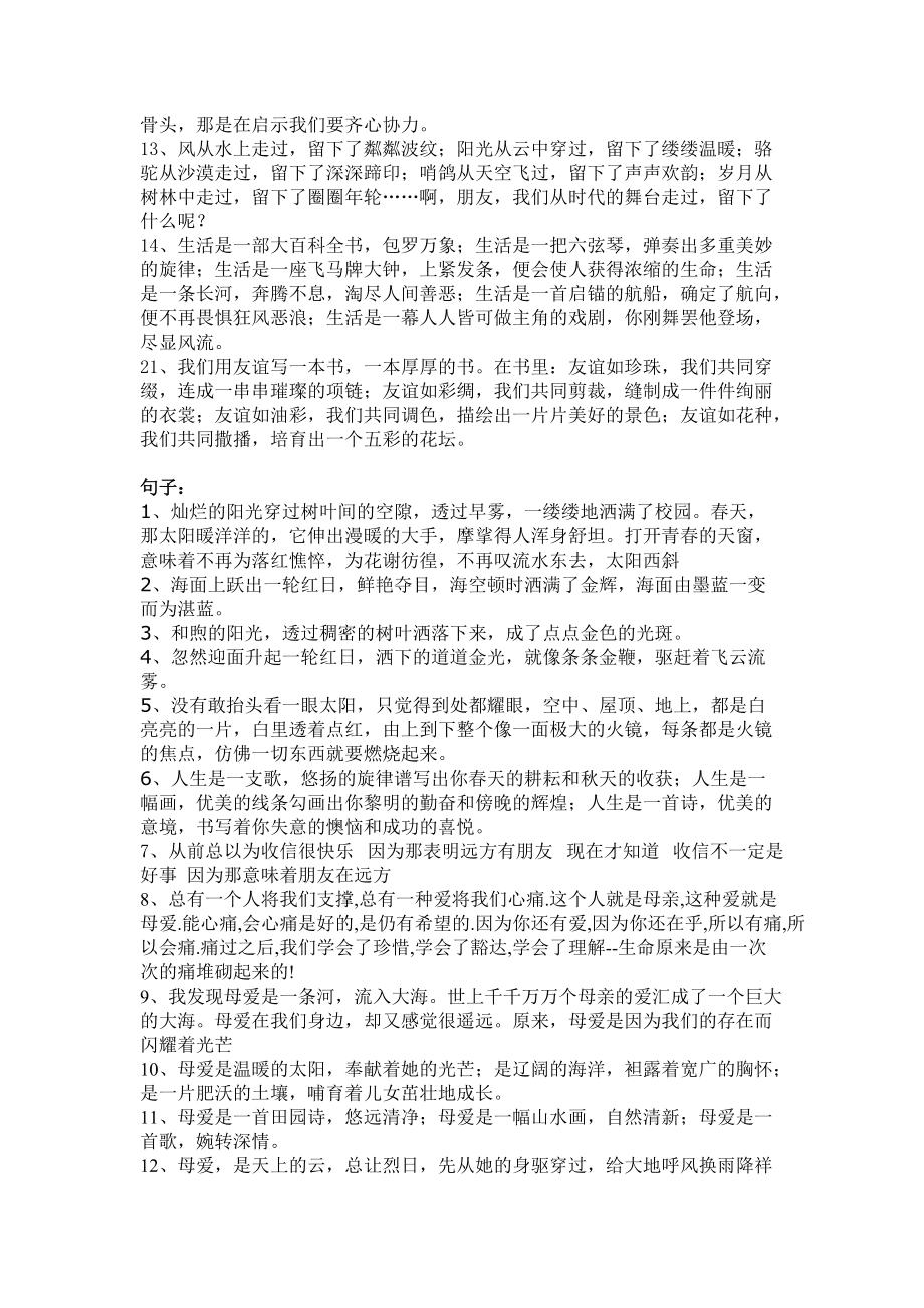 学生摘抄的语句集锦 1 书包是一只船,载着我去泛游学海,冲急流,越险滩,飘流远航,到达胜利的彼岸书包又是珍宝,它融有妈妈的情和爱,给我勇往直前。到现在,我才明白“人生难得几回醉”这个句子的意思,大概这农家的生活就是一樽醇美的浓酒,有谁能够不醉呢 29盛夏,天热得连蜻蜓都只敢贴着树荫。