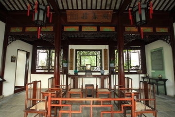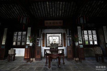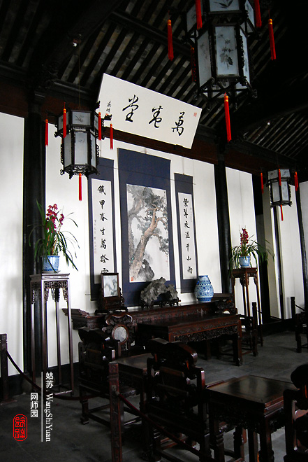 国学万卷堂 又称“积善堂”,面阔五间,位于门厅天井之后,是园主喜庆宴请、家族议事和接待宾客的主要场所。厅堂正面高悬明朝四大才子之一文征明所书“万卷堂”匾。两旁对联“紫苒夜湿千山雨,铁甲春生万壑雪”为张辛稼所书。东西两壁,对称挂大理石山水挂屏,厅堂内为一套明式家具。穿过大厅是面宽五间带厢内厅,俗称女厅。梁架下大匾系绿色底黑色字,名曰“撷秀楼”,这是晚清著名学者俞樾所书。qbenv国rj3ai学duiqo网a987d