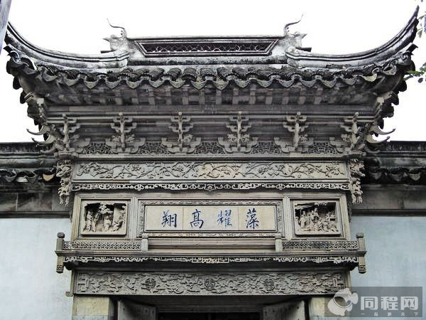 国学主厅万卷堂前的砖雕门楼尤为著名。不但雕刻精致,而且饱经沧桑300余年后仍然古雅清新,完好无损,精美绝伦,享有“江南第一门楼”的盛誉。砖雕门楼位于门厅和大厅之间,高约6米,宽3.2米,厚1米,门楼东西两侧是黛瓦盖顶的风火墙,古色古香。顶部是一座飞角半亭,单檐歇山卷棚顶,戗角起翘,黛色小瓦覆盖,造型轻巧别致,挺拔俊秀,富有灵气。屋檐下枋库门系四方青砖拼砌在木板门上而成,并以梅花形铜质铆钉嵌饰,既美观大方,又牢固实用。ad78q国w7ead学kjdnv网a8d87