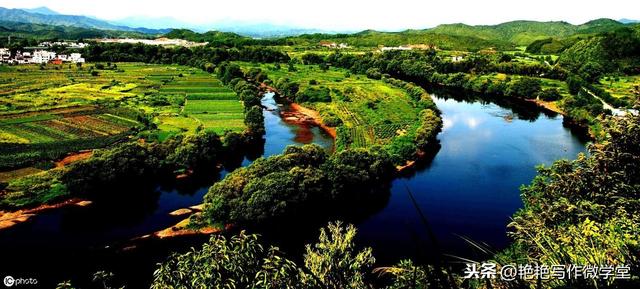 例3、站在山头远远看去,村边那条清亮的小河像一条美丽的彩带,将村子点缀的更加动人。