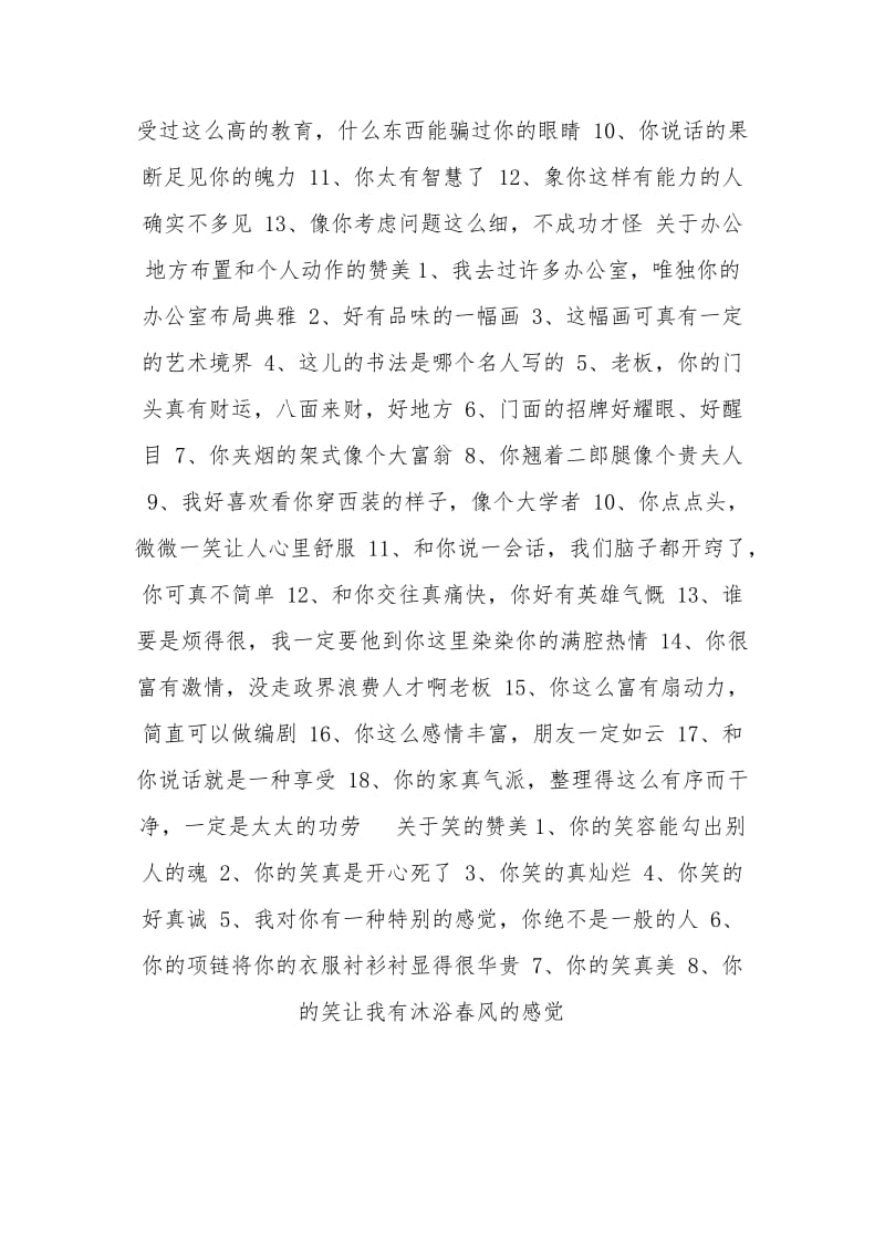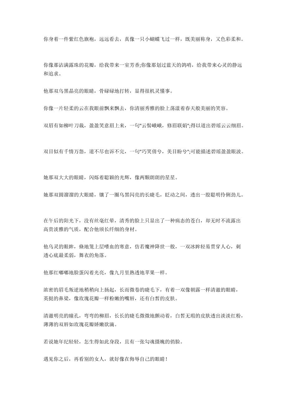 9你是一尊象牙雕刻的女神,大方端庄温柔姻静,无一不使男人深深崇拜10你笑起来的样子最为动人,两片薄薄的嘴唇在笑,长长的眼睛在笑,腮上两个陷得很举。