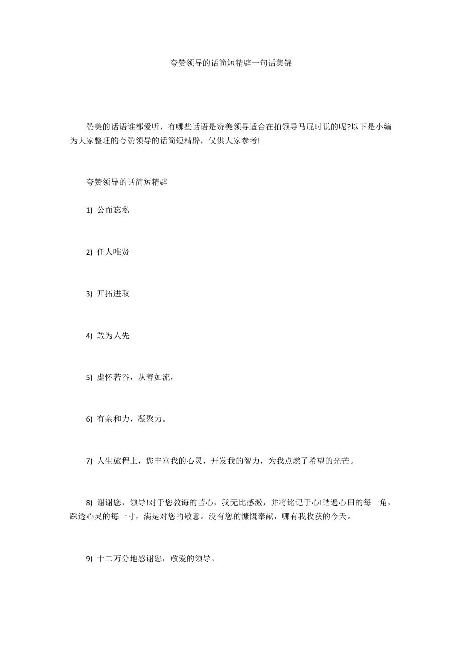 很多人不知道怎么样去赞美领导,说的太明显的话,会造成适得其反的效果接下来小编为您收集整理了赞美领导的经典语句,欢迎阅读学习 赞美领导的经典。3在以后的工作当中,我将不辜负领导的期望,更加尽心尽职,努力工作,并不断学习提升自己的工作技能,用实际行动为xx店的发展尽自己的绵薄之力4。二听领导一席话,胜读十年书 三你在这里有着不可取代的位置 四象 赞扬领导的话简短精辟41句 赞美领导的话简短精辟37句 夸领导的话简短精辟40。
