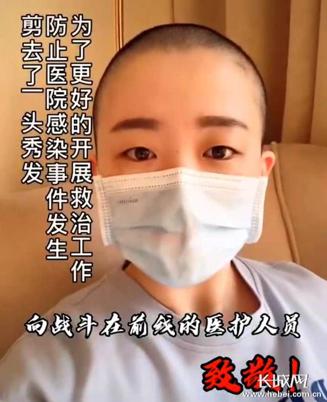 剪掉长发后的肖思孟。 ——1月29日,为充分做好救治工作,河北省援鄂抗疫医疗队队员、省中医院呼吸科90后护士肖思孟,到武汉后剪掉了自己的长发,以便穿戴防护服,避免交叉感染。将浓密的黑发几近剃光,姑娘,虽然你外貌没有过去好看,但你的内心的美丽,却是那样的耀眼。