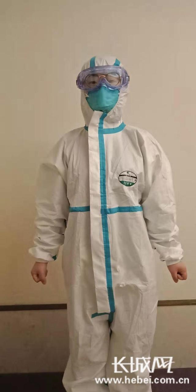 穿好防护服的王亚美。 ——河北医科大学第四医院呼吸内科护士王亚美驰援武汉后,每天要穿着厚厚的防护服工作十个小时。上班前少喝水、少吃东西是常态,虽然工作起来还是会有点紧张,但她干劲儿十足,很快就适应了武汉的工作环境。