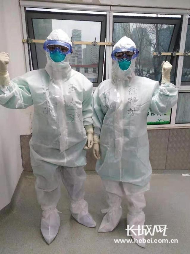 身穿防护服的徐艳芳(右)。 ——河北医科大学附属第一医院感染科护士徐艳芳到武汉后,因在工作中直接接触患者,回到酒店需要隔离,不能和多年未见的好友相聚。但她却马上调整情绪“武汉当地的医务人员,已经奋战多日,下班后还不能回家,这种舍小家为大家的精神更值得我们学习。”