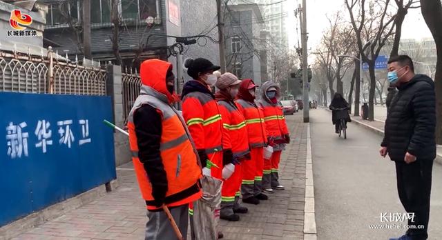 武晓峰(右)叮嘱环卫工注意安全。 ——春节期间,石家庄市新华区卫生队实行24小时防疫值班制度,所有一线员工上岗按照要求统一着装、配备工具,佩戴口罩手套。队长武晓峰每天为当班环卫职工逐一测量体温,体温正常方可上岗。