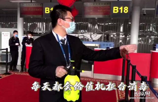 刘晨每天在场地消毒。 ——为了避免乘客聚集,石家庄机场开放了全部值机柜台,并且每两个小时消毒一次,保证旅客安全。地面服务部值机员刘晨每天在场地消毒,虽然春节无休,但他态度昂扬,“我们每个人都加把劲儿,相信疫情很快会有所好转,我很有信心!”(长城新媒体记者 赵娇莹 整理)