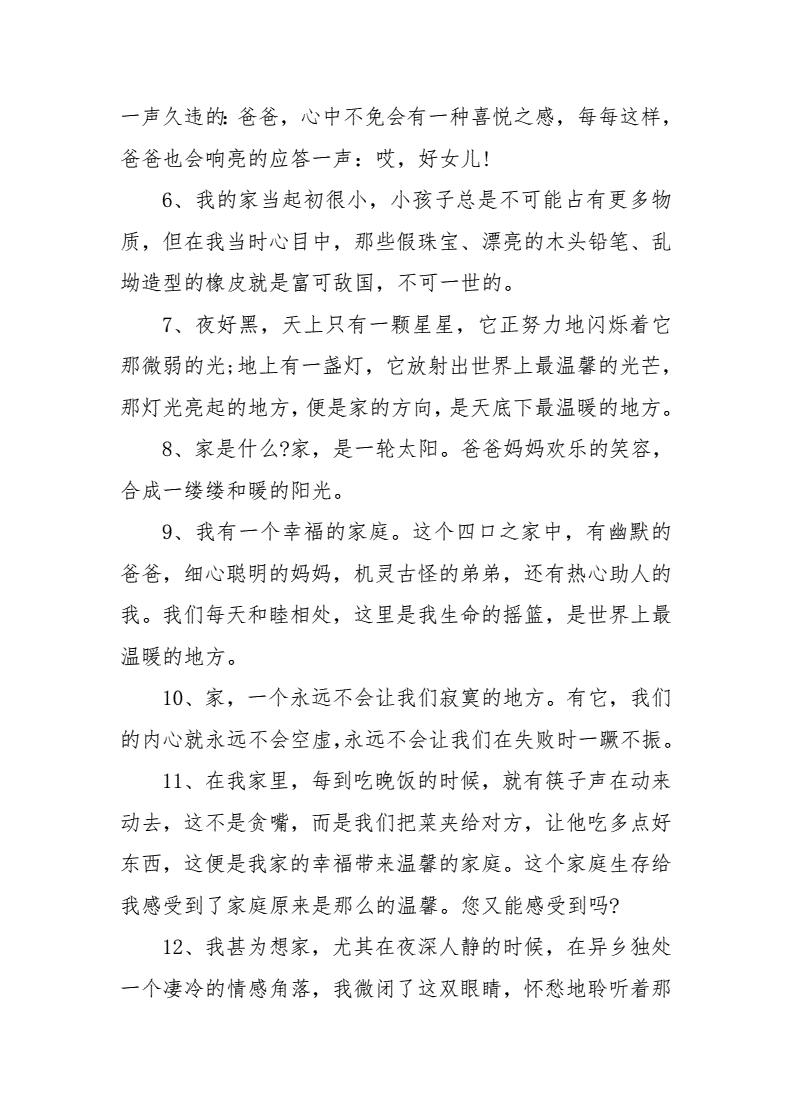 2016年12月13日家庭幸福美满的句子8因为有家,因为有深沉的牵挂,生命才不会因无根而枯萎也是因为有家,以内为有如此深沉的牵挂,生命才会熠熠生辉 9人生嘛。2019年10月28日幸福 一家人句子1孩子是爱情的结晶,父母的宝贝,家庭的宠儿,有了孩子才是真正意义上的家庭孩子让爱情更加健康和稳固,孩子让家庭充满快乐和甜。